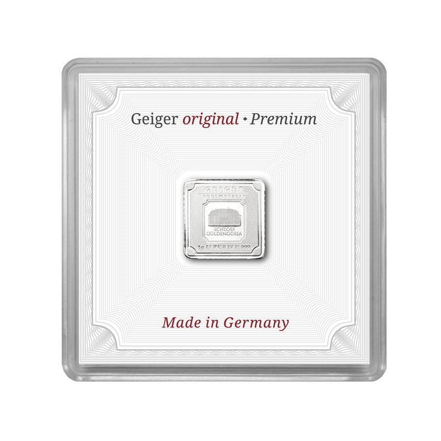 · Hersteller: Geiger Edelmetalle · Ausgabeland: Deutschland · Metall: Silber · Feinheit: 999 · Feingewicht: 1 g · Abmessung: 10,6 × 10,6 mm · Herstellungsart: Geprägt · Verpackung: Sicherheitskapsel mit Zertifikat (49 × 49 mm) · Serie: Geiger Original (geprägt) · Warentyp: Silberbarren
