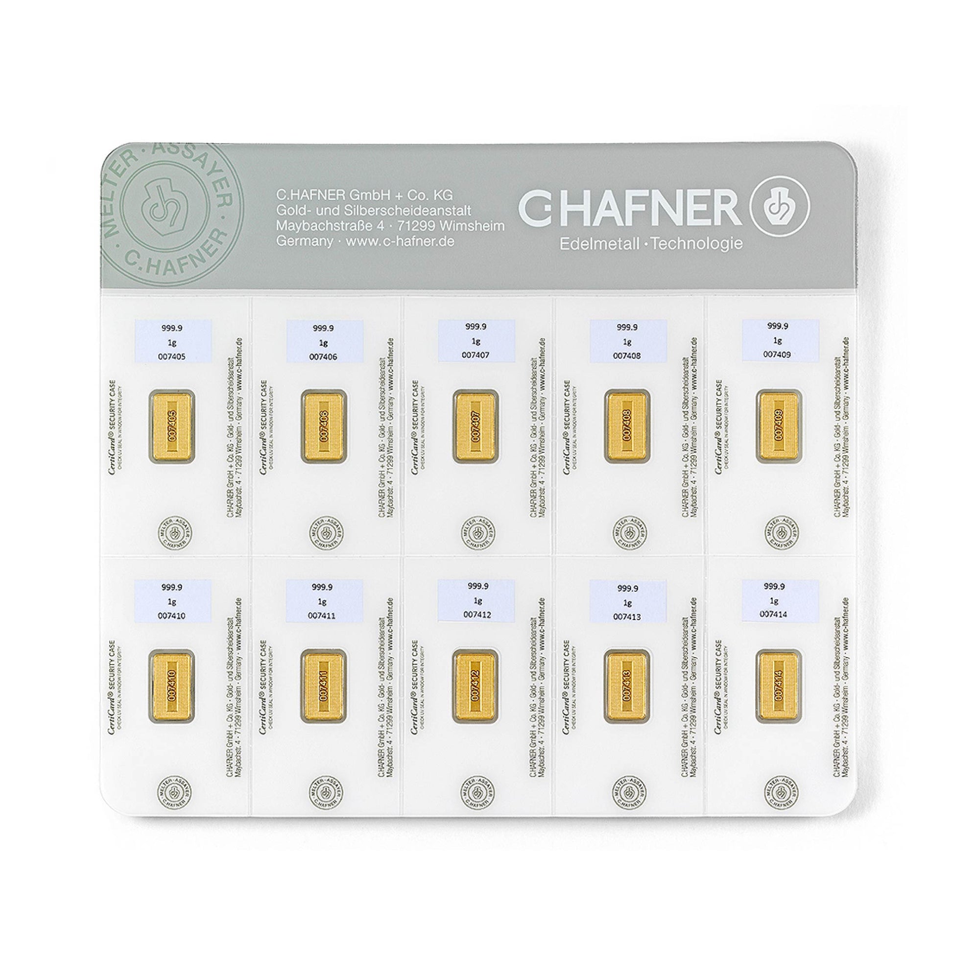 Jeder einzelne Barren ist aus 999,9er Feingold geprägt, mit individueller Seriennummer und zertifizierter Herkunft. Als LBMA-zugelassene Scheideanstalt produziert C. Hafner ausschließlich in Deutschland – CO₂-neutral und mit 100 % recyceltem Sekundärgold.